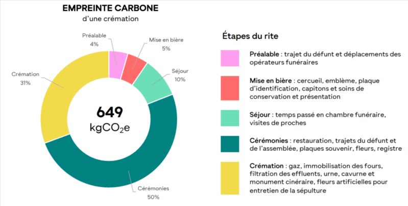 Avec une moyenne de 620 kg CO₂, l'inhumation a un impact légèrement plus faible sur l'environnement que la crémation qui rejette 649 kg CO₂. Ces données sont assez variables d'une famille à l'autre, notamment en fonction du nombre de convives ou de fleurs utilisées lors des cérémonies.