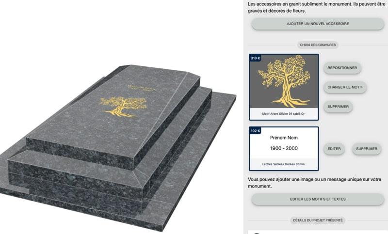 Les familles peuvent demander à faire graver des inscriptions directement sur la tombale ou intégrer des éléments décoratifs : motifs de tous styles, symboles religieux ou même des gravures personnalisées à partir d'une photo.