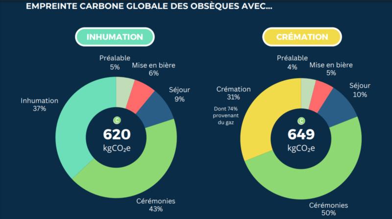Avec une moyenne de 620 kg CO₂, l'inhumation a un impact légèrement plus faible sur l'environnement que la crémation qui rejette 649 kg CO₂. Ces données sont assez variables d'une famille à l'autre, notamment en fonction du nombre de convives ou de fleurs utilisées lors des cérémonies.